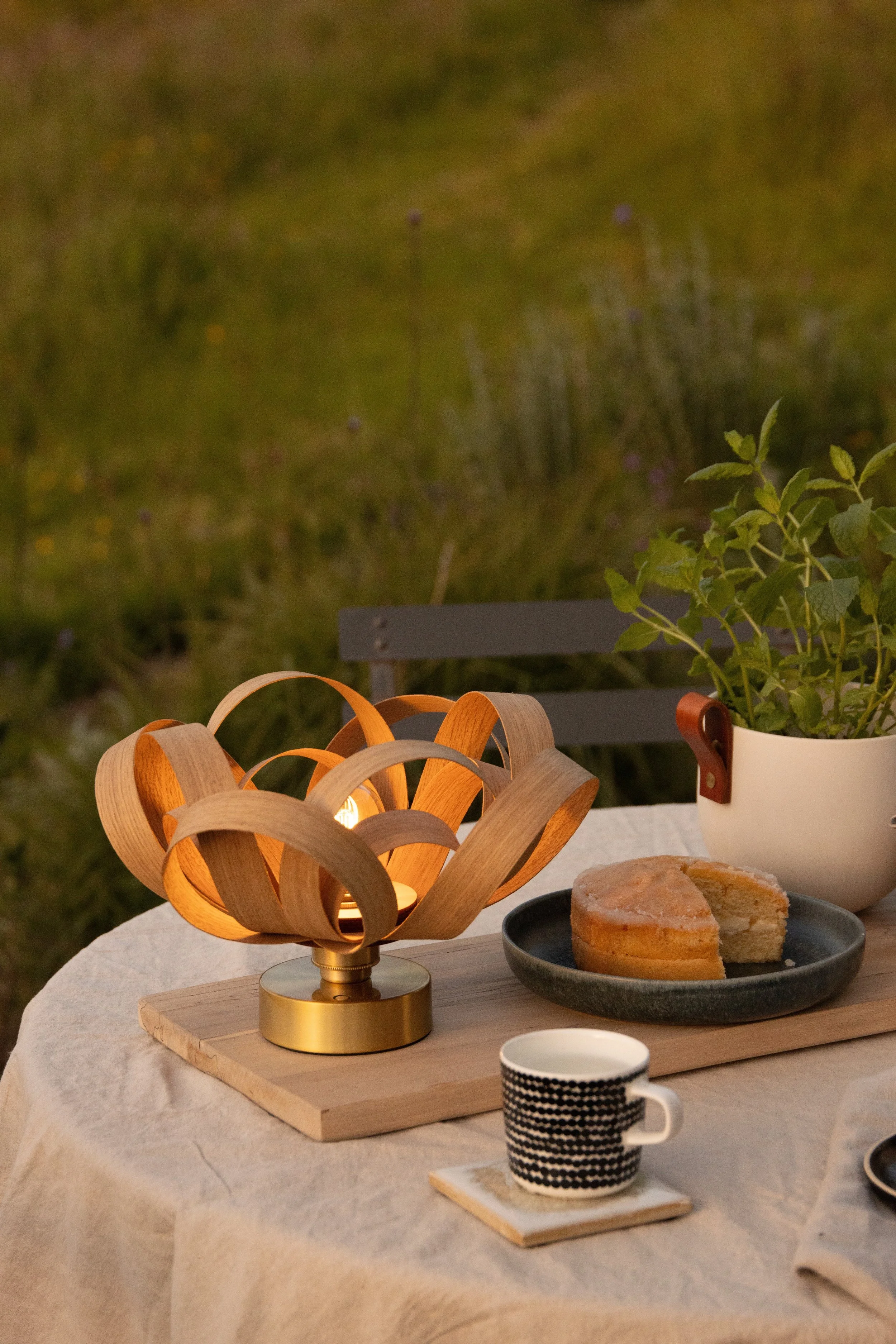 Designer lighting brings high-end craftsmanship to portable lamps in the shape of this striking piece from Tom Raffield. At the London showroom, I was able to see for myself its sculptural, flower-like shape, beautifully crafted from twelve steam-bent wooden petals. It's sustainable, bringing Scandinavian-inspired simplicity and natural materials together. Being rechargeable with a dimmable touch button, it’s practical too. This lamp, like other rechargeable models, also works just as well inside but has the flexibility and bulbs that can be used outdoors too.