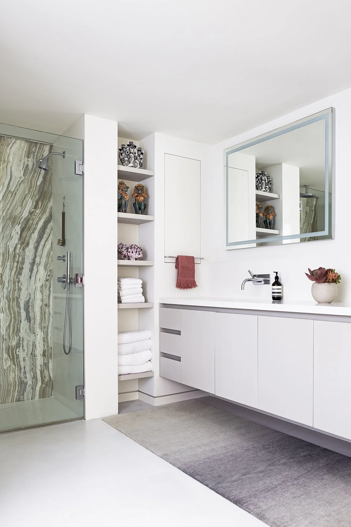 These simple, built-in shelves provide storage for towels, but also for decorative pieces, like the unusual ceramics and a cluster of coral displayed on three of the upper shelves. Including these more ornate pieces gives a more curated feel and is far more considered than just showing typical bathroom items like product bottles, which can easily look cluttered.