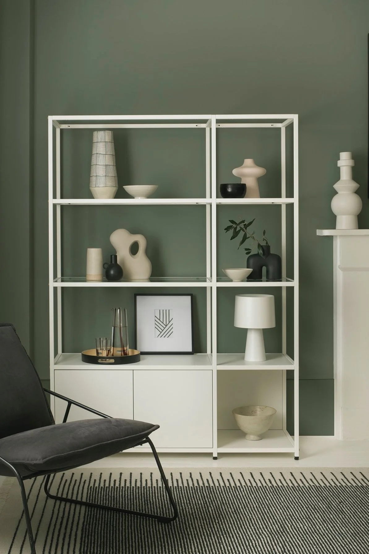 I really like this shelving unit as it’s such a simple yet effective way to add structure to a room while giving you extra display space. The soft white frame pops beautifully against the green wall - it’s subtle, but adds the right amount of contrast without overpowering the room.
