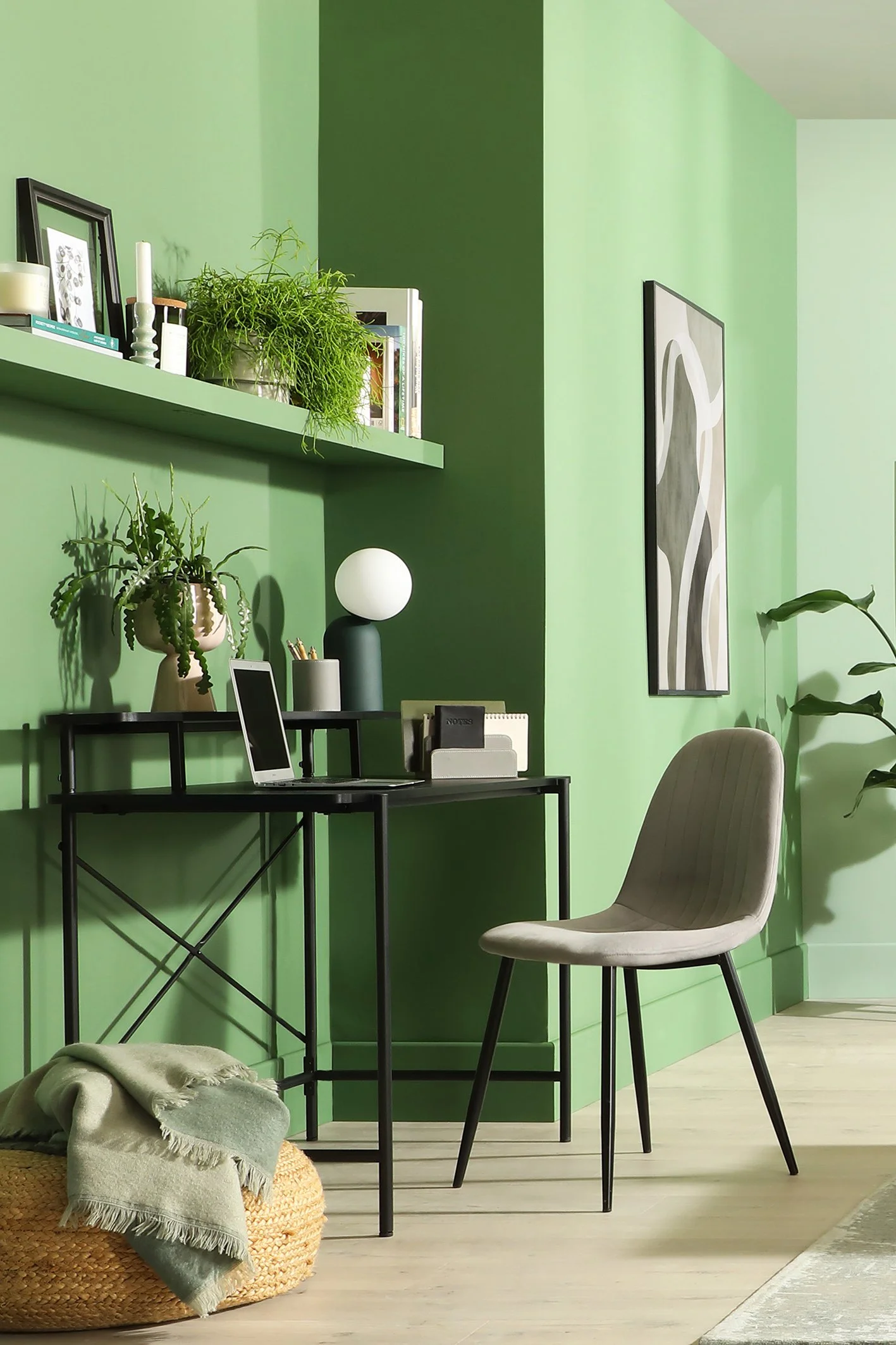 Positioned just above the desk by Furniture And Choice, it draws the eye not only because of the colour but also thanks to the thoughtful styling. There’s a mix of books, both stacked and upright for variation, a candle holder, and some artwork - all coming together to create a lovely layered look. A plant adds a natural element and echoes the green tones of both the wall and shelf.