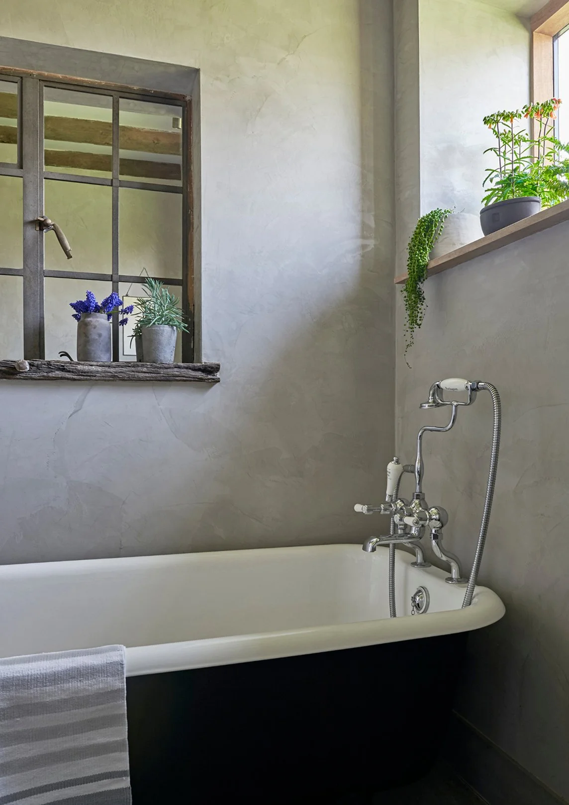 This is another room where new finishes, like the Tadelakt plaster walls, are teamed with traditional style, such as the roll-top bath and original Crittall windows, which George has cleverly upcycled into a mirror. The sill is made from a piece of driftwood, which really adds natural texture and has been styled simply with rustic concrete pots, brimming with flowers and plants, to add greenery and enhance the overall look of the bathroom.