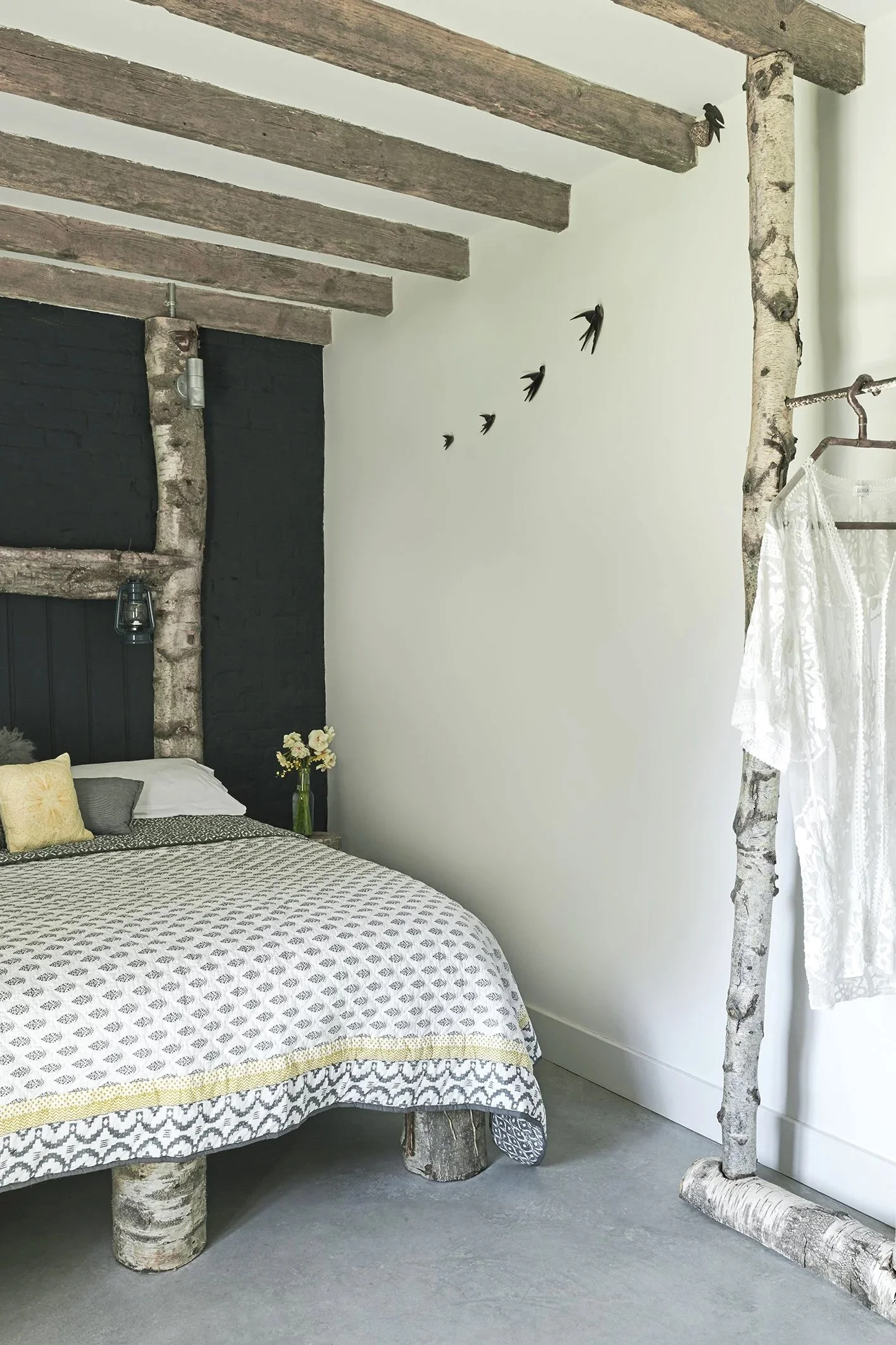 This has to be one of the most unique bedrooms I have ever styled and photographed. George hand-crafted the entire bed frame from silver birch trees found on the farm, which, with the raw bark, has that natural, rustic feel. I love how the rugged timber sits against the clean, modern, polished concrete floor, and how even the clothes rail and dressing table have been fashioned from the same wood, making the whole room feel connected to its rural surroundings.