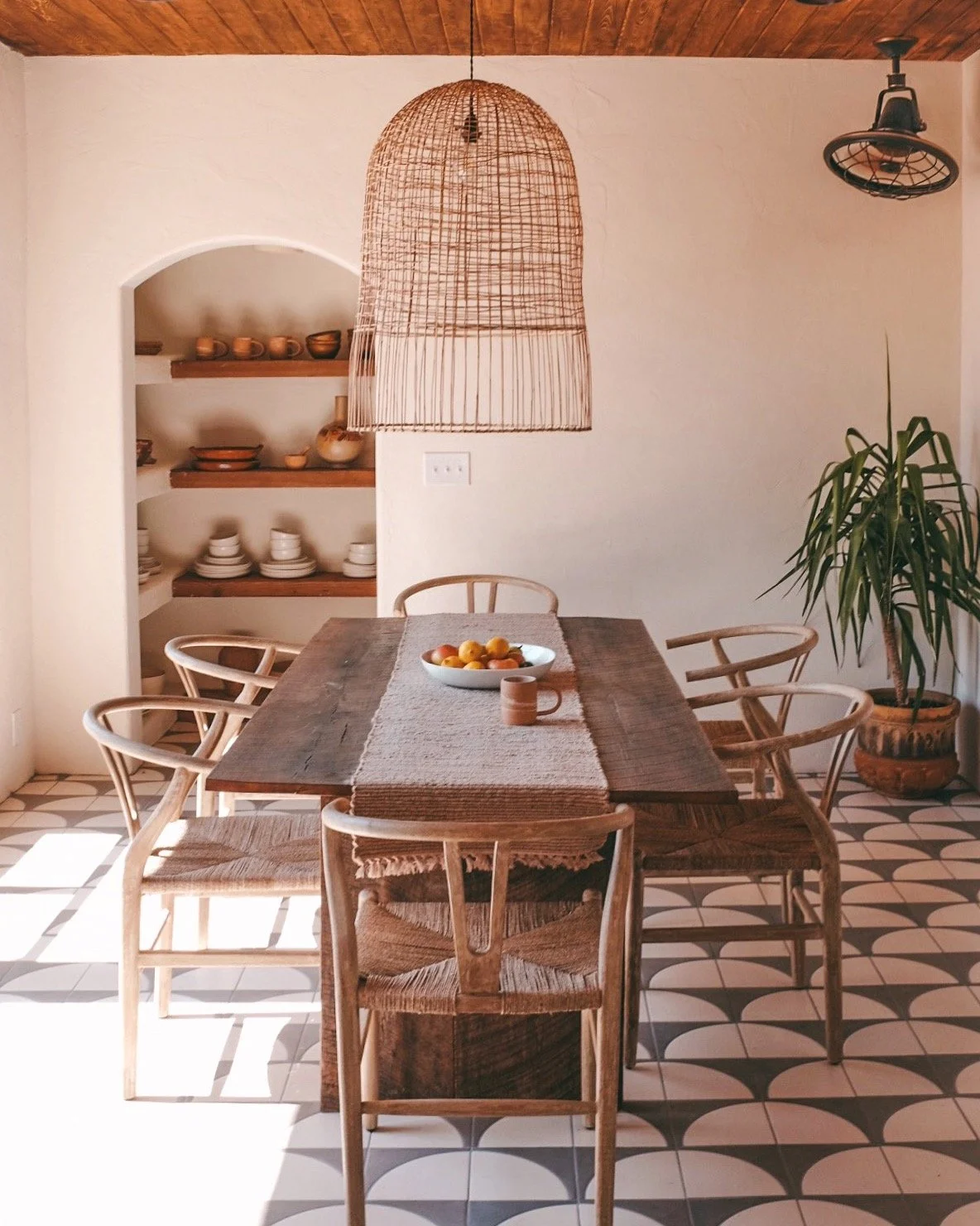 This dining room is stunning with its mixed fe materials - the geometric tiled floor, and ethereal pendant light hanging above the rustic wooden table. Look through the arch, and you’ll notice built-in shelves with the wood echoing the table’s grain and ceiling beams. Earthy-toned tableware, glasses, wooden bowls, and other earthenware items are all beautifully displayed on the mix of wood and plaster shelving, giving the whole space a cohesive feel.
