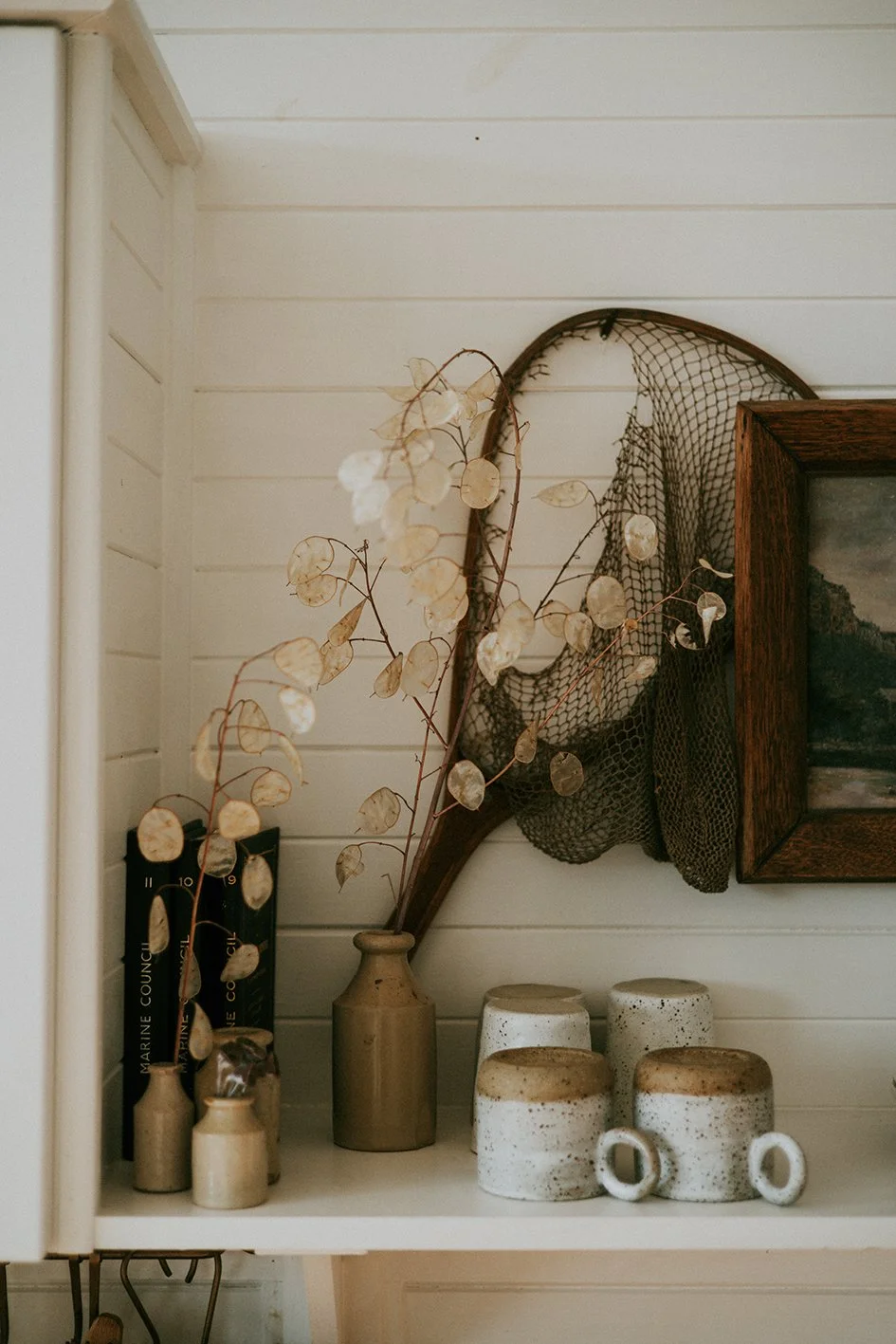 Set against the shiplap wall on a shelf in the kitchen, Sarah has arranged a series of different-sized clay pots displaying stems of the dried silver dollar plant, next to vintage framed artwork and a timeworn fishing net. A neat row of earthenware cups is attractive and practical, as they are easy to find for guests.