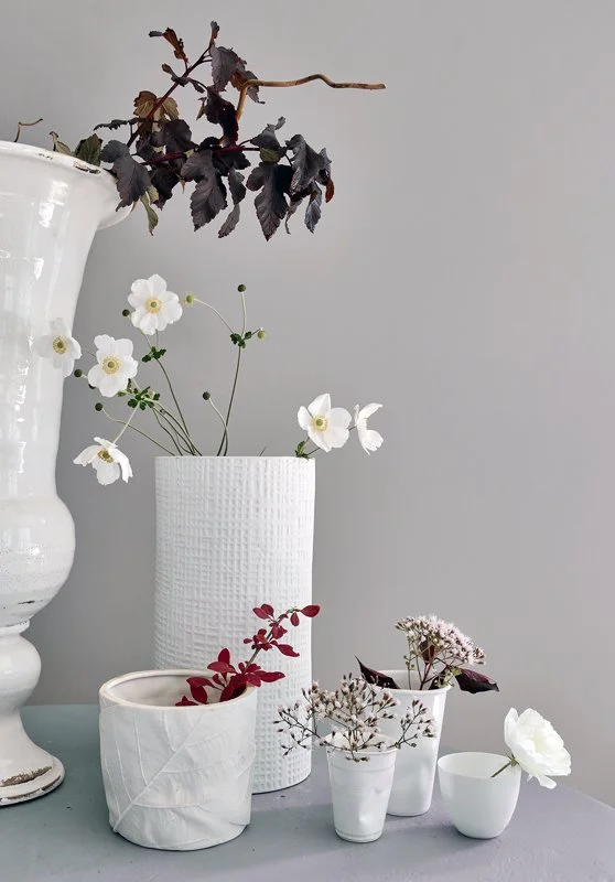 This is my own collection of white vessels that I styled for a shoot with a mixture of branches and flowers. What works with this collection is firstly, the varying heights and shapes, and secondly the different textures on the pots - from shiny to patterned and plain.