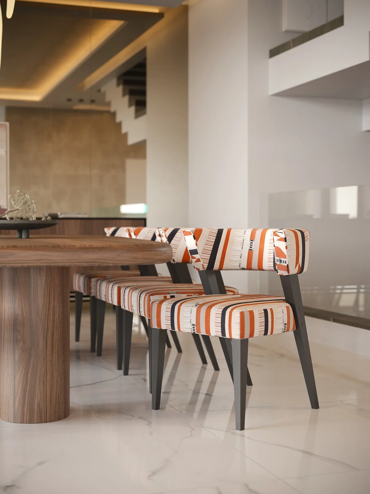 Patterns and prints can make an interior more three-dimensional, adding another layer of texture to the overall scheme. In this image, the striking, patterned chairs from the Stylish Club really add interest to this contemporary-style interior.