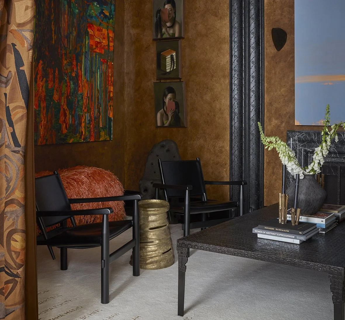 This was one of my favourite rooms at WOW!House, as it is rich with texture and colour and so atmospheric. The tactile interior is enhanced further by a couple of metallic pieces with the sculptural side table and candlesticks on the coffee table.