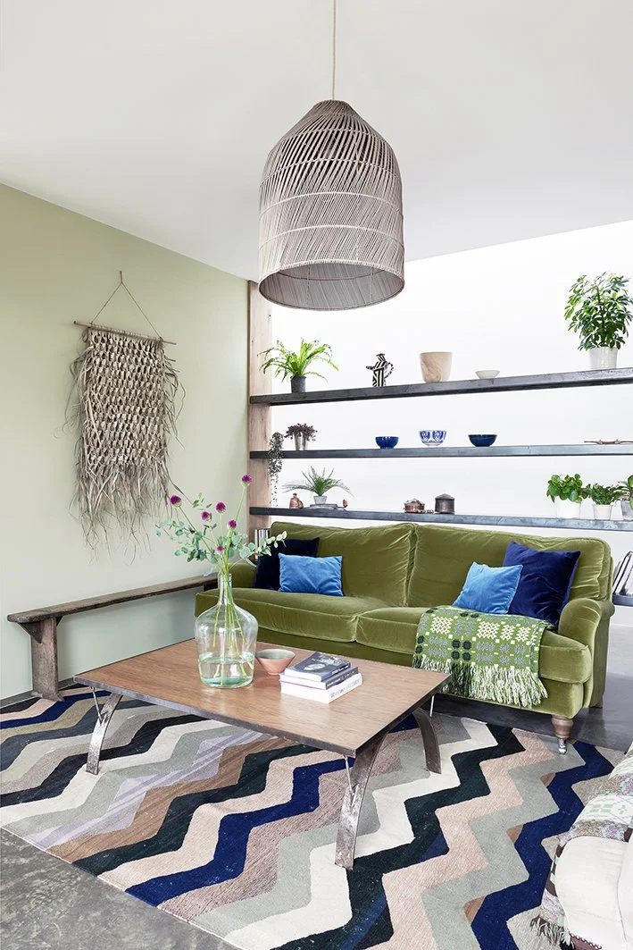 Rugs are an ideal way to add pattern to an otherwise plain interior. The zig zag rug pictured here is a statement in its own right and contrasts perfectly with the velvet sofa. Notice that the sofa cushions are kept plain so as not to compete with the rug, with just a throw bringing in a different pattern.
