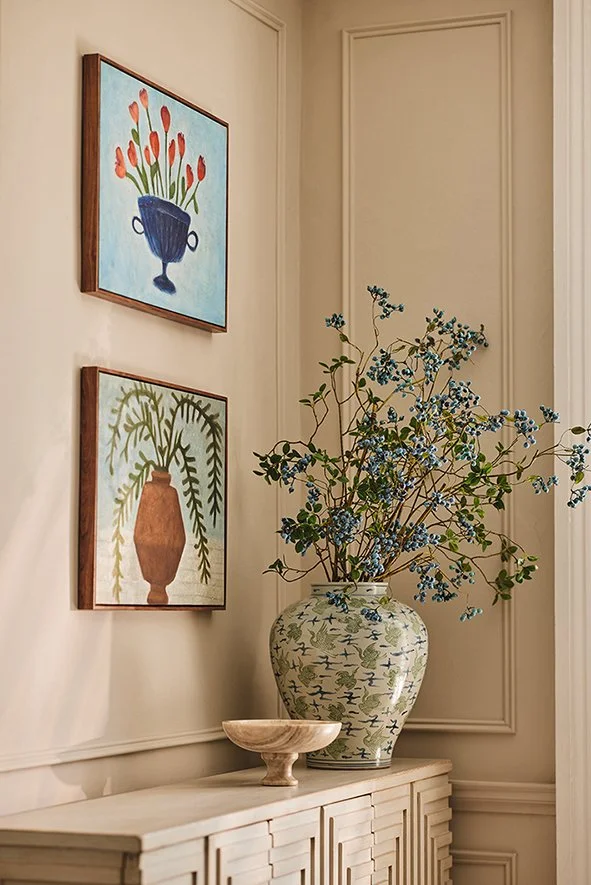 You can bring art into your vignette, like the two framed pieces from Oka pictured here which, placed above a beautiful patterned vase with branches of berries, instantly create an eye-catching display. If you are creating your vignette on a console table like this one, you can also lean a frame against the wall, which is always good to do in the first instance to see if the group works together before you put a nail in the wall.