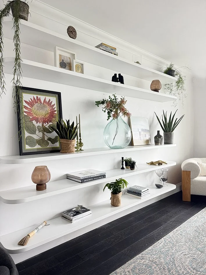 What I like about shelves is that they are functional but also really add to the decorative appeal of a room. They naturally draw the eye and allow you to showcase gorgeous things, such as personal artefacts, together with decorative items, artwork, and books. Whether floating shelves in a minimalist living room, recessed in an alcove, or purpose-built like the wood and steel ones pictured above, shelves offer you the chance to play around with displaying items in various textures, colours and shapes. By mixing books, decorative objects, and framed art, with a plant or two, you can create a display that feels stylishly curated but also personal and lived-in. When styling shelves, balance is really the key. It always takes me at least a couple of weeks of moving items around before I am satisfied. Start by layering objects of different heights, materials, and textures. On larger shelves, you can feature books stacked both horizontally and vertically to create variation. A bit of greenery, such as a small potted succulent or trailing plant, brings freshness to the shelving. But avoid doing what I do, which is overcrowding. A little empty ‘negative’ space is just as important as the objects, allowing them the room to shine. Rearrange and rotate your pieces until you are pleased with the result. Once you have everything in place, just like with a vignette, it’s really useful to take a photo and also to leave the shelves for a few hours before coming back to reassess your styling skills.