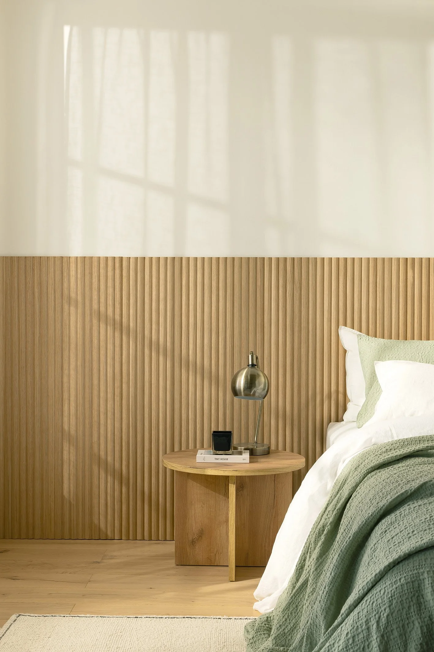 If you want to bring natural materials into the interior decoration, a fluted headboard or wall is a great way to introduce nature, like the Natural Oak Reeded wall panels by Naturewall featured here. I have something similar in bamboo, which brings an organic and coastal feel to my bedroom.
