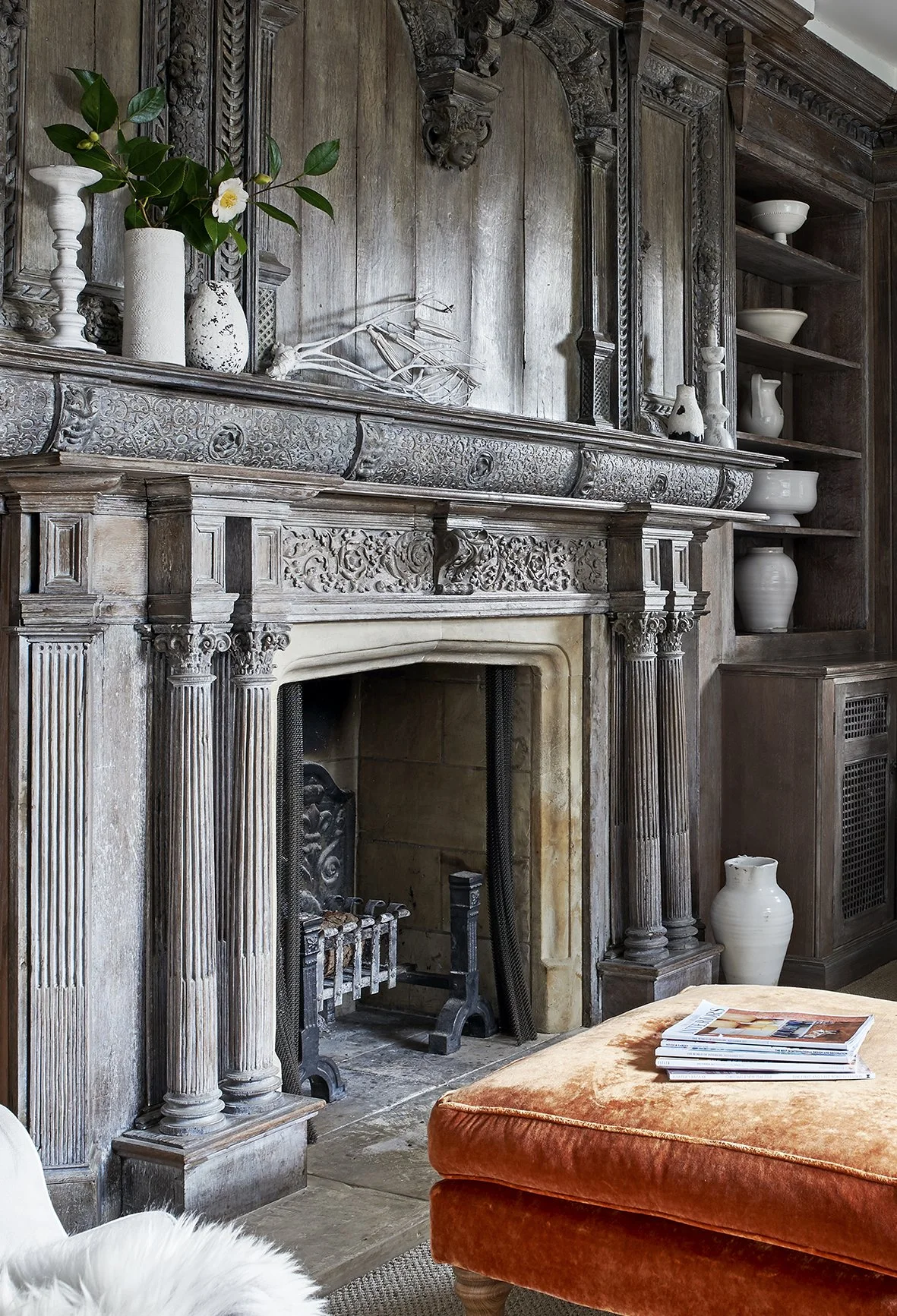 A curated collection of items in a theme, such as the white vessels pictured on this ornate mantel, really make an impact. Displayed on a surface such as a shelf, table, or mantel, a collection is a great way to turn everyday objects into an intentional feature.