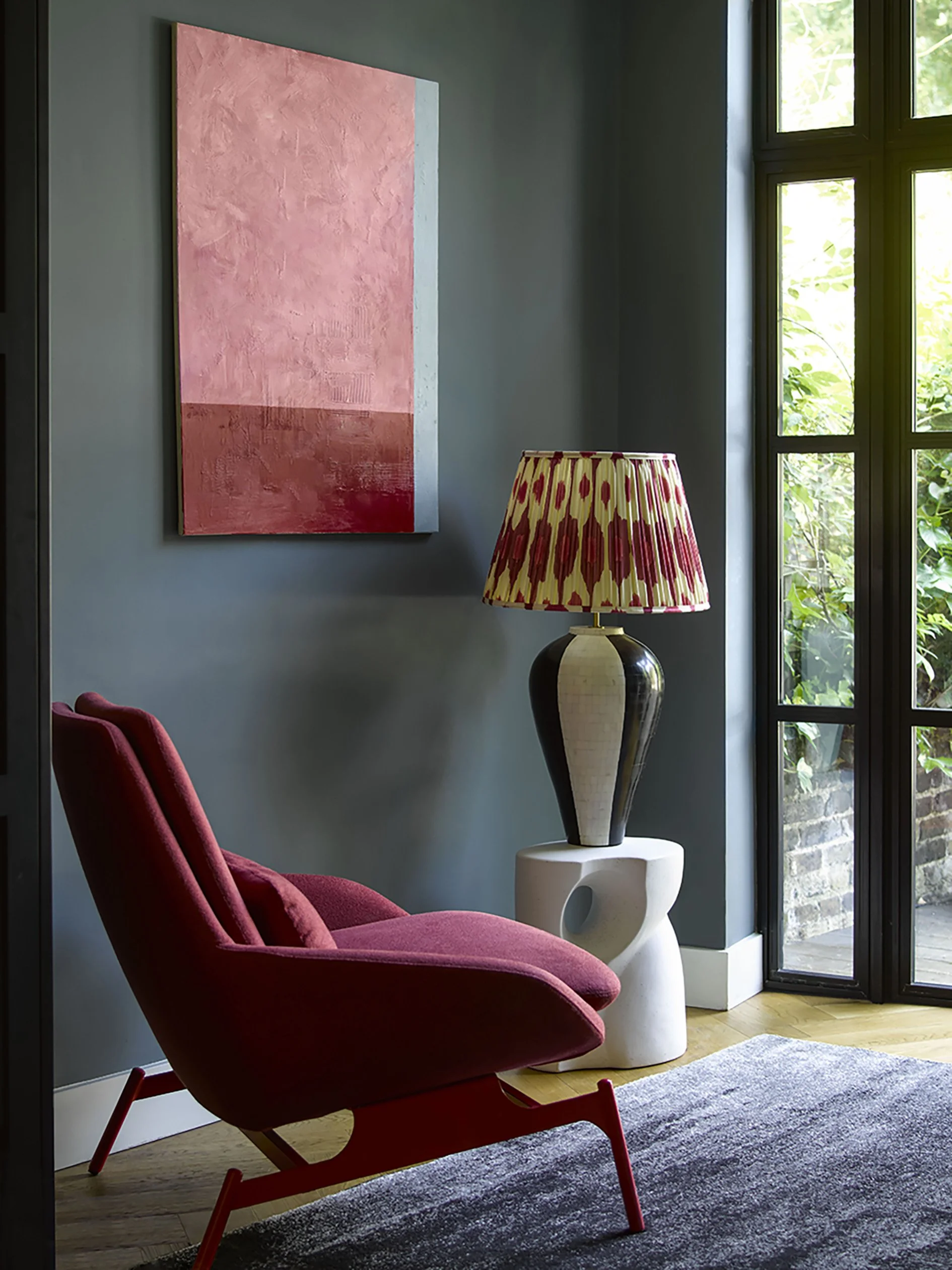 Table and floor lamps are a great way to bring pattern, colour and texture into a room. Although not a floor lamp, this gorgeous lamp by Pooky, with its Ikat print in berry-coloured tones, placed on a table adds height so it stands proud and is a key feature in the room.
