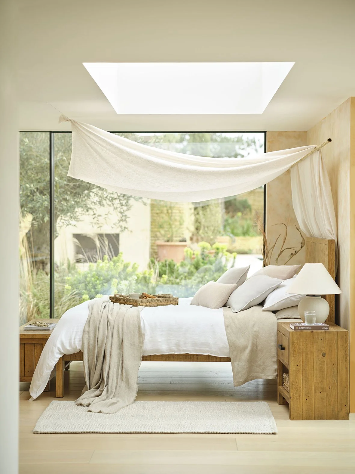 This gorgeous bedroom has plenty of natural materials with pure linen bed linen, pillowcases, and a throw, as well as a wooden bed frame and table beside the bed from Garden Trading.